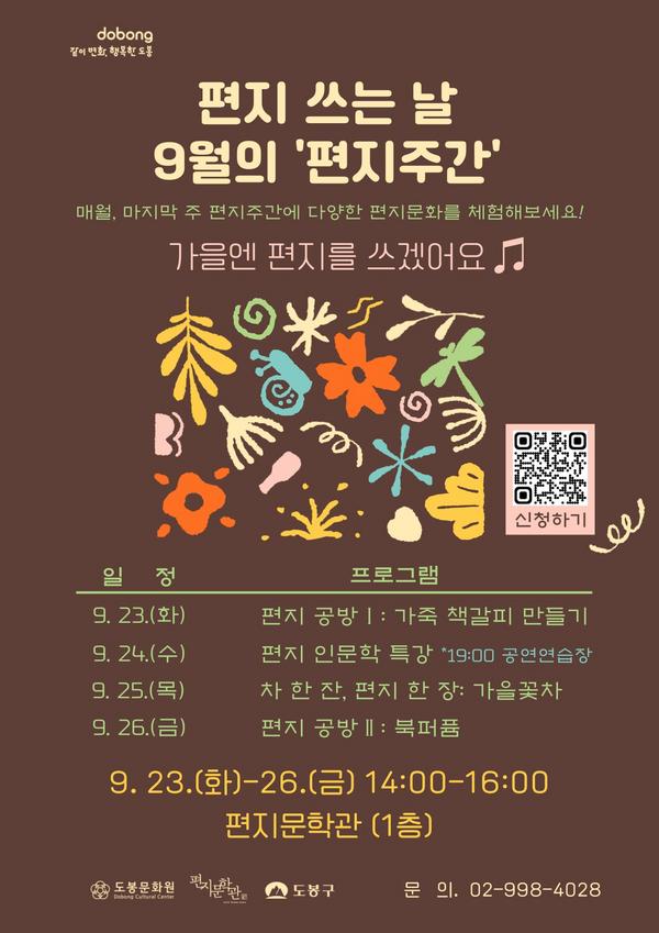 도봉문화원(원장 최귀옥) 산하 편지문학관이 23일부터 시작해 오는 26일(금)까지 ‘9월의 편지 주간’을 개최한다.