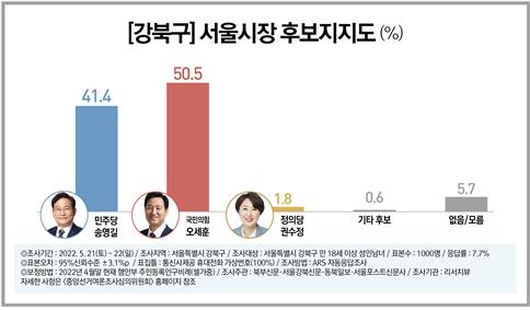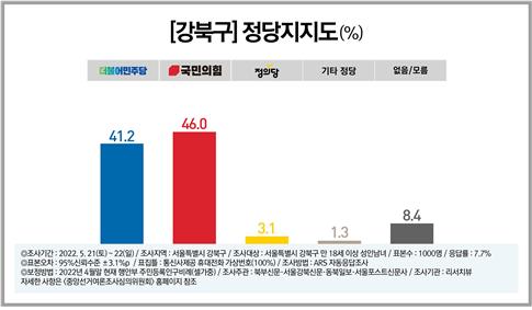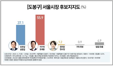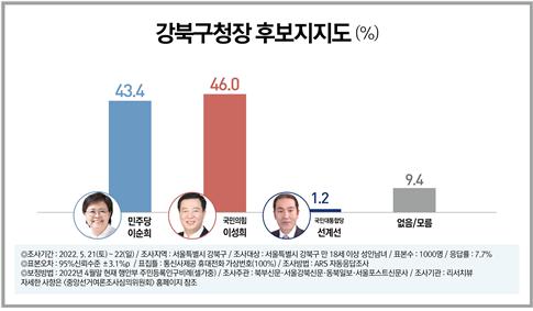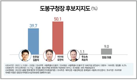 오는 6.1 민선8기 지방선거 여론조사에서 서울 도봉구청장에는 국민의힘 오언석 후보가 오차범위 밖의 차이로, 서울 강북구청장에는 국민의힘 이성희 후보가 오차범위 내의 차이로 민주당 김용석 후보와 이순희 후보를 후보지지도에서 각각 앞서는 것으로 나타났다.