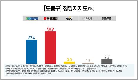 정당지지도에서 도봉구의 경우 국힘이 50.9%, 민주당이 37.6%로 오차범위 밖인 13.3%포인트 앞섰다. 이는 이번 대선때 득표율보다 4.3%포인트 높은 것이다.