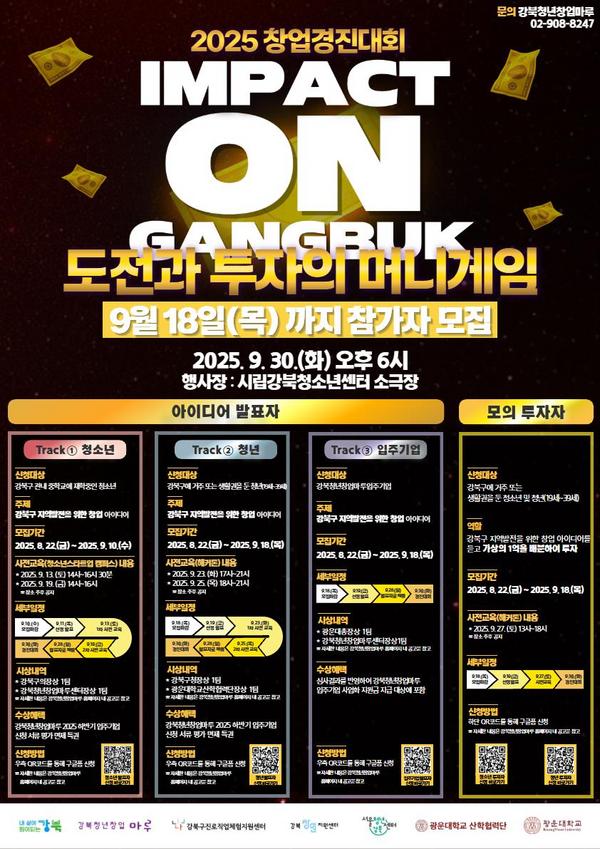 강북구(구청장 이순희)는 오는 30일(화) 오후 6시부터 9시까지 시립강북청소년센터 소극장에서 「2025 창업경진대회(IMPACT ON 강북 : 도전과 투자의 머니게임)」을 개최한다.