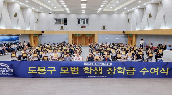 도봉구(구청장 오언석)는 지난 9월 17일 구청 2층 선인봉홀에서 ‘2025 도봉구-귀뚜라미 문화재단 장학증서 수여식’을 열고, 지역 내 중?고등?대학생 68명에게 장학증서와 장학금을 전달했다.