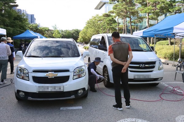 ▲ 서울북부지방검찰청 주차장에 마련된 안전점검 행사장에서 도봉구민이 추석을 앞두고 차량을 점검받고 있다.